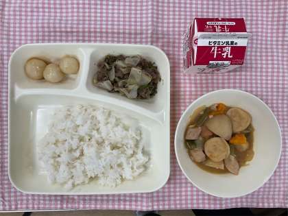 12日は月見の行事献立「ごはん、一口がんもとさといものみそ煮、牛肉と野菜のいためもの、みたらしだんご、牛乳」でした。さといもやだんごが登場!だんごはしっかりかんで食べるよう声かけし、よく味わっていただきました。