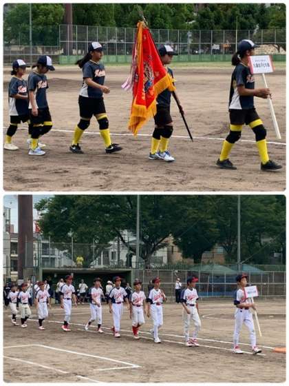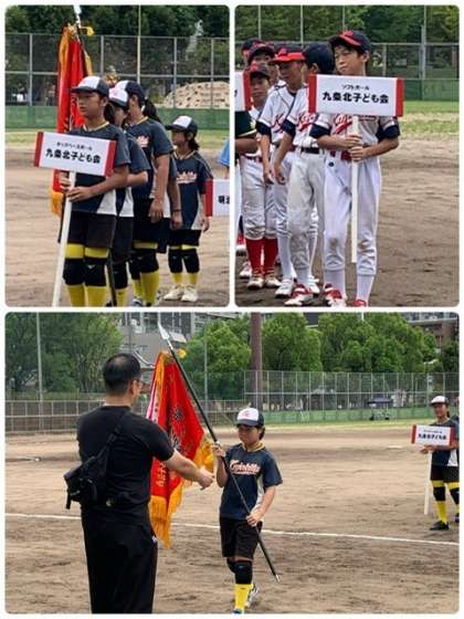 9月15日(日)、西区「子ども会親善キックベースボール・ソフトボール大会」が松島野球場で開催されました。九条北小学校からも参加しました。入場行進に続いて、開会式です。開会式では、昨年度優勝チームである「九条北小学校キックベースボールチーム」から優勝旗返還を行いました。