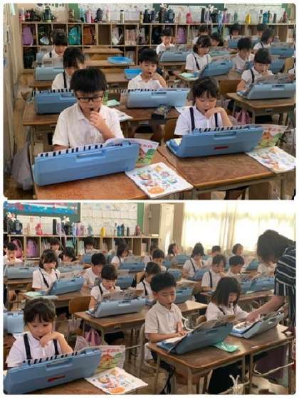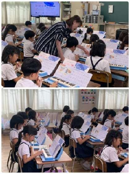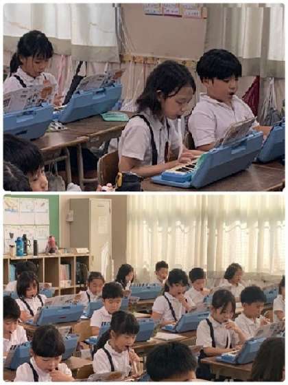 2年生の音楽の時間です。鍵盤ハーモニカの練習をしています。先生の伴奏に合わせながら、いろいろな曲を演奏しました。