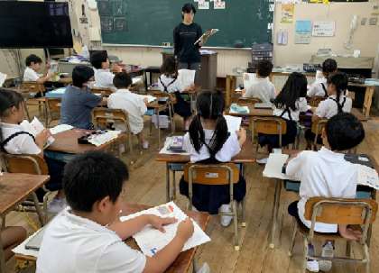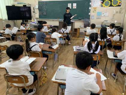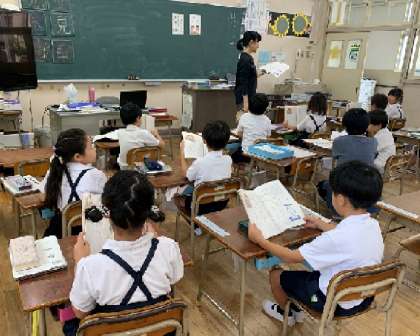 1年2組の国語の時間です。「サラダでげんき」の音読をしています。句点や読点で次のお友だちにバトンタッチします。それぞれ、今、どこを読んでいるのか見逃さないように、指で追って行ったりと工夫しながら取り組んでいました。