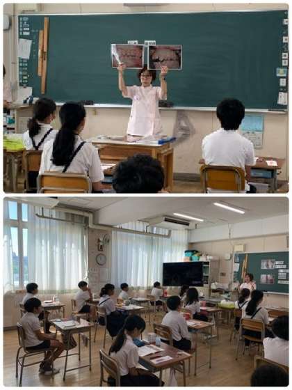 9月16日(金)、6年生対象に、2時間目に1組、3時間目に2組で「歯と口の健康教室」を実施していただきました。最初に、20年前の野生の猿と動物園を猿の歯の写真を題材に、歯の健康のために大切なことを、わかりやすく教えてもらいました。