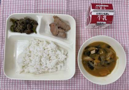 25日は「ごはん、鶏肉のてり焼き、かぼちゃのみそ汁、なすのそぼろいため、牛乳」でした。しっかり味のついた鶏肉はごはんがすすみました。なすはひき肉と一緒にいためて、食べやすい仕上がりでした。