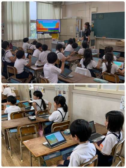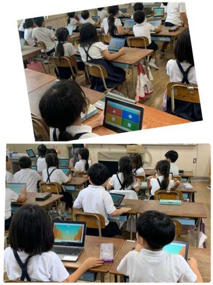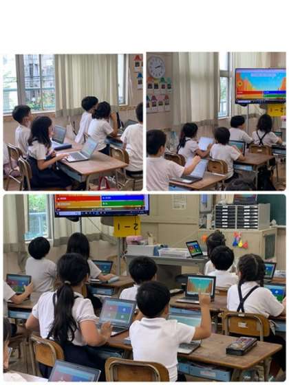 2年生の教室の様子です。学習したことがクイズ形式で出題されるアプリを活用して、楽しく学習しています。答えは選択式で、学級の正解率も即座に出るので、とても盛り上がっていました。