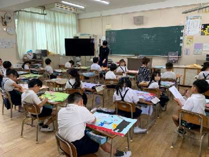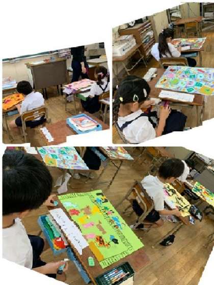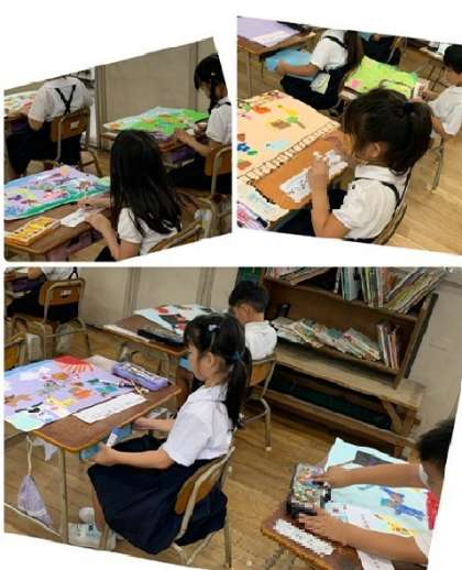 1年2組の図工の時間です。作品の仕上げをしています。出来上がった児童から「作品名」をつけました。とても素敵な作品の完成です!