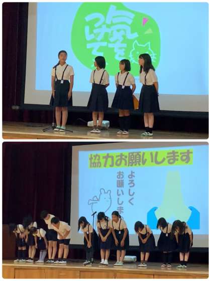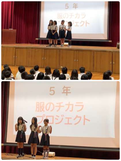 10月4日(金)、児童集会を開き、5年生から全校児童へ呼びかけをしました。最初に「よしもと放課後クラブによるワークショップ」で学んだ漫才を通して「SDGs」について紹介してくれました。次に、この「服のチカラ」プロジェクトの趣旨について説明してくれました。さらに、「いつ、どのように集めるのか」そして「注意事項とお願い」などについても伝えてくれました。