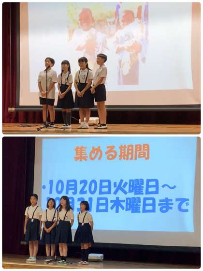 10月22日(火)〜10月31日(木)の登校時(8時10分〜8時25分)に、5年生が玄関のところで回収します。ぜひ、「ご家庭で使わなくなった子ども服がありましたら、ご協力をお願いいたします!!」