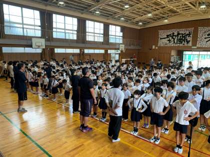 続いて、生活指導担当の先生からは2つの話がありました。1つめは、10月の生活目標「手洗い・うがいを心がけよう」です。2つめは、「地域の公園などの使い方について」です。ごみは持ち帰るか、ごみ箱に捨てること。そして、みんなが気持ちよく使えるように心がけましょうと話をされました。