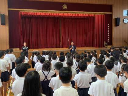 10月7日(月)の児童朝会は、講堂で実施しました。最初に、校長先生からは、金曜日に5年生から呼びかけのあった「戦争などで家をなくした子どもたち服を送るプロジェクト」に協力することが、みんなの「SDGsの取り組み」となるとの話がありました。また、情報委員会が作成・掲示してくれた「SDGsのポスター」のこと、お昼の放送で流してもらっている{SDGsラジオ」についても触れられました。さらに、小学生ができる「SDGs」の取り組みの紹介もあったので、できることから取り組んでみましょう。(詳しくは「校長室だより NO29」をご覧ください。)