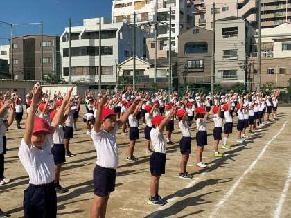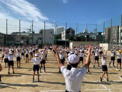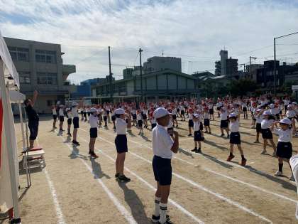 運動委員会のメンバーが前に出て、ラジオ体操の練習をしました。