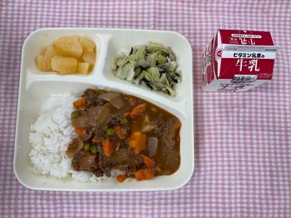15日は「ハヤシライス、キャベツのひじきドレッシング、白桃(カット缶)、牛乳」でした。上新粉でとろみをつけるハヤシライスは、少しあっさりした仕上がりですが、ラッキーにんじんも入り大好評でした。