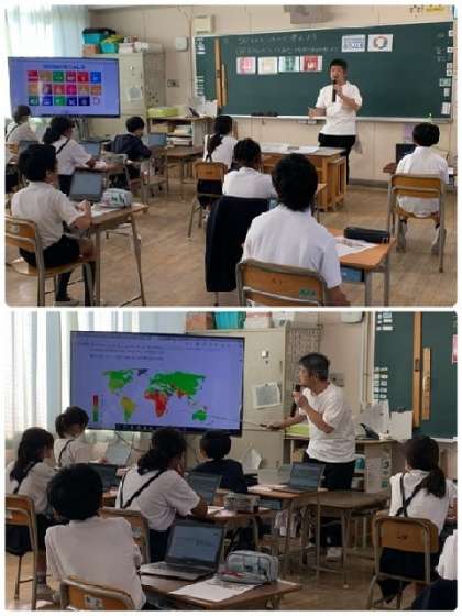 6年生は、総合の時間の学習で「SDGsについて」学習しました。様々な写真や資料を活用しながら、「SDGsとは」そして「SDGsの17の目標」について話をしてもらいました。印象に残った内容をワークシートに記入したり、タブレットを活用して調べたり・・・興味を持って学習してくれました。今回の学習を終えて、自主学習で自ら調べてきた児童もいました。とてもうれしいです。「自分たちにできること」を考え、少しずつでも取り組んでほしいと願っています。