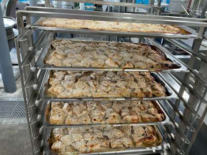今日の給食は「パンプキンパン、かつおのガーリックマリネ焼き、ウインナーとじゃがいものスープ、キャベツのサラダ、牛乳」でした。かつおはノンエッグドレッシングの酸味とにんにくの風味でおいしく焼き上がりました。