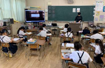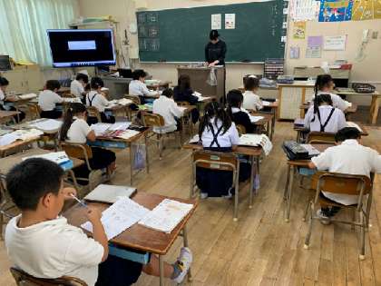 1年2組の生活の時間です。学習園に咲く「コスモス」の観察をしました。よく観察して、教室に戻ってから、その様子を観察カードに書き込みました。