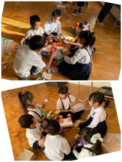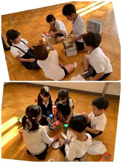 1年1組の算数の時間です。単元「かたちあそび」の学習をしています。この単元では、身の回りにある立体図形について、特徴や機能を生かして形を構成し、具体的な操作を通して形の構成について考えるとともに、図形に親しみ、学んだことのよさや楽しさを感じながら学ぶ態度を養うことを目標としています。おうちの方の協力で集めた、いろいろな形の箱を班で持ち寄り、どうしたら高く積み重ねることができるか試しています。班でアイデアを出し合いながら、工夫しています。