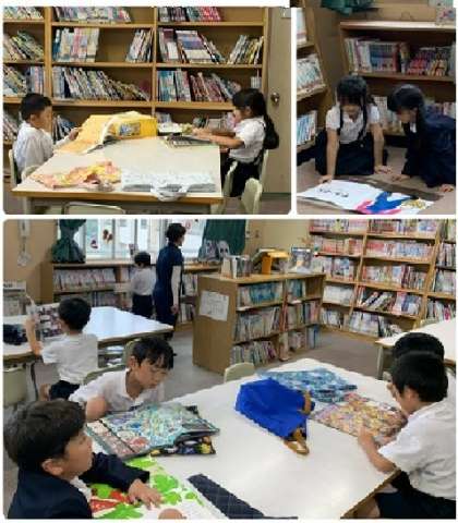 1年1組の図書の時間です。図書室で好きな本を探しています。興味のある本を見つけた児童から、読書を楽しんでいます。