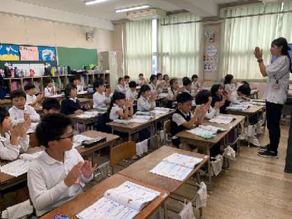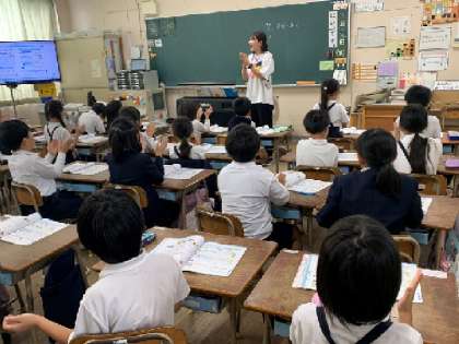 2年生の音楽の時間です。今日の学習は、「おまつりの音楽〜くりかえしを つかって 音楽をつくりましょう」です。まずは、使っていくリズムを手拍子などで練習をしていきました。さらに、くりかえしなどを工夫して、楽しいリズムを作っていきます。