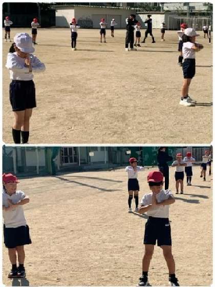 まずは準備体操。柔軟体操に続いて、「鉄棒」に必要な力を育てる動きをしました。両手を肩の高さに「グー・パー」を繰り替える運動は、少しずつでも日頃から取り組むと良いと教えてもらいました。そこから変化して、体と同時に頭の使う運動(シナプソロジーといいます)に挑戦しました。片手は「グー・パー」を繰り返し、もう一方は「グー・チョキ・パー」・・・なかなか苦戦していました。続いて、体の前で手のひらを合わせて、互いにグーっと押し合う・・腕の力がつきそうです。