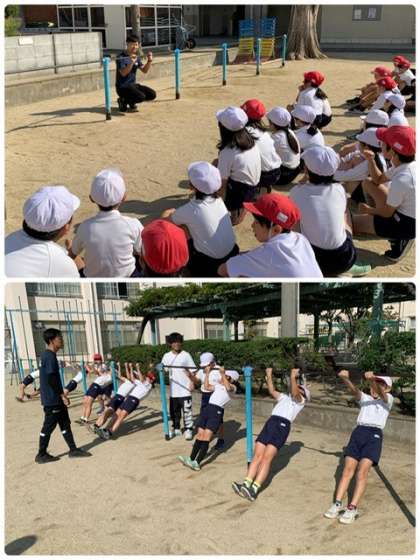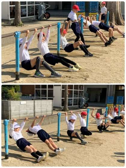 3年生 体育〜プロのインストラクターに指導していただきました! 公開日 2024/11/14 更新日 2024/11/14 お知らせ 鉄棒のところに移動しました。「逆上がり」に必要な要素を少しずつ教示してくれています。まずは、「手は順手でも逆手でも大丈夫」「親指でロックする(鉄棒から手が離れないように)」「手を伸ばし切らないで、鉄棒に体を引き付ける」・・・しっかり鉄棒をにぎって、ぶら下がる動きや、体を引き付ける動きを、交代で行いました。。 いいね(0)