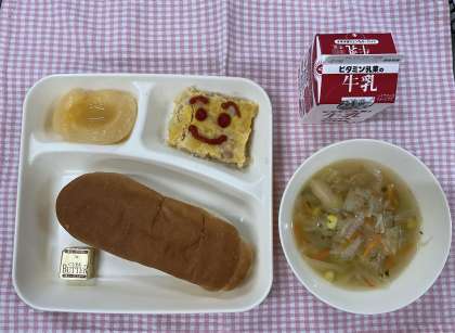 18日の給食は「コッペパン、ツナポテトオムレツ、スープ、白桃(缶)、牛乳」でした。ツナポテトオムレツはクラスごとにミニバットに具材を入れて焼き物機で焼き上げ、食べる時に小袋のケチャップをかけました。パンにはさむ子もいました。