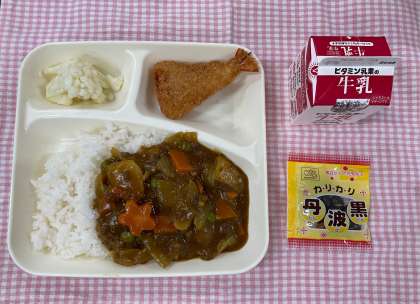 20日は「えびフライカレーライス、カリフラワーのピクルス、いり黒豆、牛乳」でした。この日は本当に大好評!何日も前から楽しみにしてくれていた子がたくさんいた献立です。準備から食べ終わるまで、とてもにぎやかな給食時間でした。