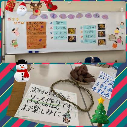 12月4日(水)のポプラタイムでは、みんなで育てた「さつまいも」を調理して、「さつまいもパーティー」をしました。グループで協力して、美味しそうに出来上がりました!違いのポプラタイムでは、さつまいものつるを使って、クリスマスのリースを作る予定です。楽しみですね!