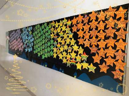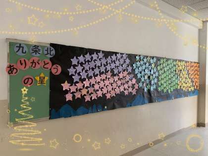 11月に、全校で取り組んだ「九条北ありがとうの星」が、北館1階の掲示板に掲示されています。「相手にしてもらってうれしかったこと」や「相手に言われてうれしかったこと」がたくさん書かれています。一つひとつを読んでいるうちに、こちらも温かい気持ちになってきます。これからも、「思いやりの行動やことば」があふれる九条北小学校にしていきましょう!!