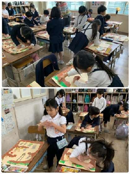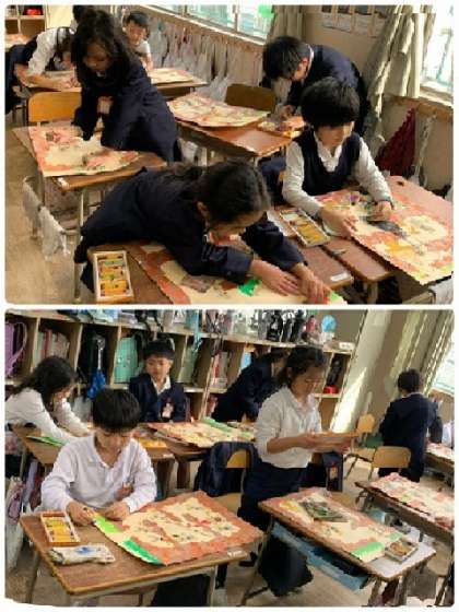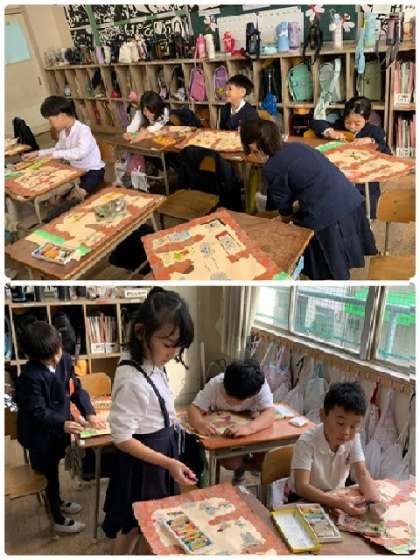 2年生 図工〜おはなし「おむすびころりん」の一場面を表現! 公開日 2024/12/12 更新日 2024/12/12 お知らせ 2年生の図工の時間です。おはなし「おむすびころりん」の一場面を絵で表現しています。ちぎり絵とパスを活用して、素敵な一場面が出来上がりました。今日から始まった「作品展」で講堂に展示しています。ぜひご覧いただき、お話の世界を楽しんでください! いいね(0)