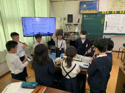 今回の授業教材は、歌唱器楽教材「せいじゃの行進」で、学習のめあては「合唱奏を工夫して楽しもう」です。2つのグループに分かれて、グループ内で役割を分担しました。まずは、グループで練習をしました。互いに意見を出しながら、どんな工夫をしたら良いかも考えて練習しています。