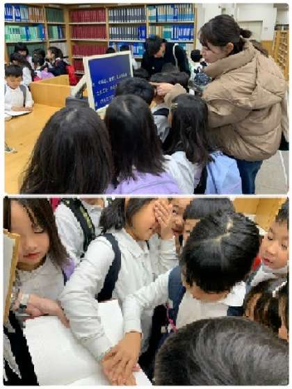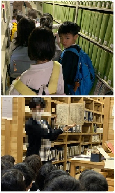 次に、目の不自由な方や車いすの方などが利用できるコーナーについてお話しいただきました。拡大して本を見ることができるものや、車いすの方の高さに合わせることができる机、点字の本や音声で聞くことができる本などがあることを知りました。実際に、それらの設備や本を見させていただきました。続いて、普段は入ることができない場所まで見学させていただきました。中央図書館で一番古い本〜江戸時代のお店などを紹介している本も見せていただきました。火災などにあわないように、大切に保管されているそうです。