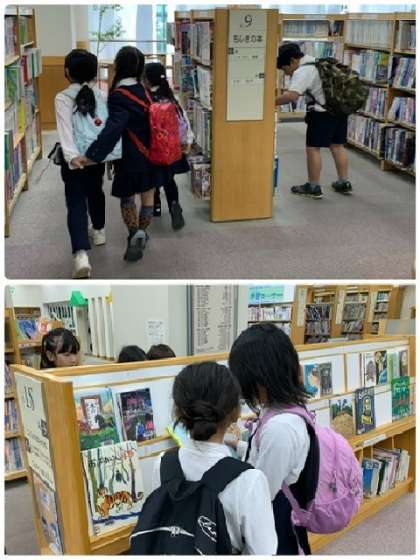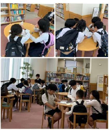 自分の好きな本を見つけて読んでいます。限られtた時間ですが、いろいろ見学をさせていただきました。学校へ帰る前に、中央図書館の前で記念写真も撮りました。
