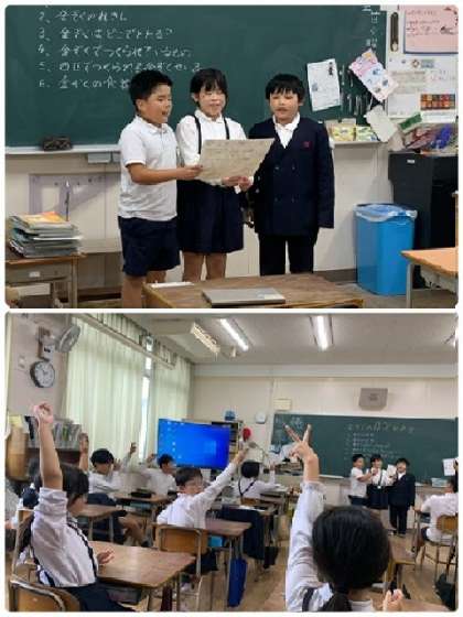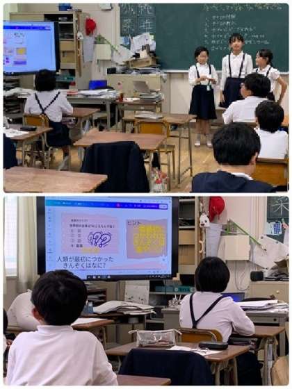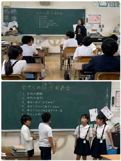 班ごとにテーマを設定し、調べたことを発表する「金ぞく探求発表会」を実施しました。最初は、それぞれの学級で実施しています。4年1組の「金ぞく探求発表会」の様子です。それぞれの班のテーマは、「1.金ぞくの種類」「2.金ぞくのれきし」「3.金ぞくはどこでとれる?」「4.金ぞくでつくられているもの」「5.西区でつくられる金ぞくせい品」「6.金ぞくの食器」です。
