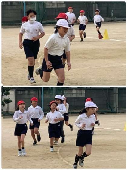 2年生の体育の時間です。授業の初めに、運動場を走っています。何周か走っているうちに、体がぽかぽか温まってきました。