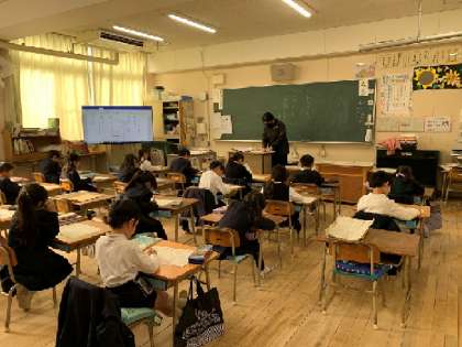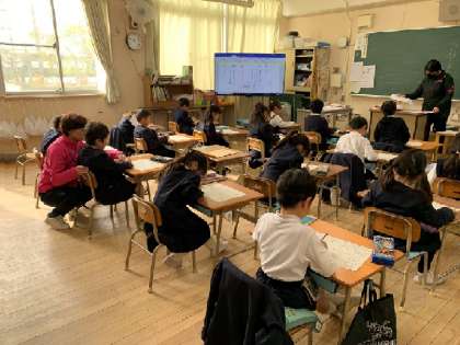1年1組の算数の時間です。単元「なんじ なんじはん」の練習プリントに取り組んでいます。時計に示される時間を見て、その時に自分が何をしていたのかを問う問題もありました。