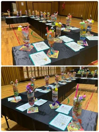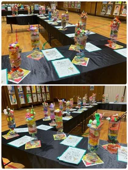 講堂に入るとすぐに、1年生の図工作品「ようこそ〜! 『パフェ』パーティーへ」のコーナーが迎えてくれました。カラフルに飾られた大きなパフェ・・その見ごたえに感動しました。作品には、それぞれの児童の「みてみてポイント」が添えられていて、その作品に込めた思いが伝わってきました。