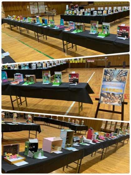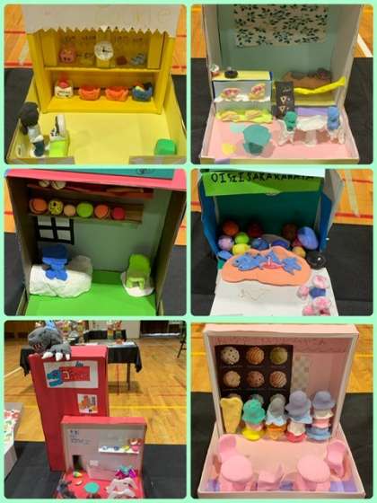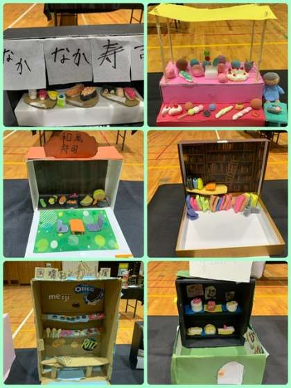 3年生の「いらっしゃい!九条北商店街」です。3年生は社会見学で「きらら九条商店街」の見学をさせていただきました。その時の学習を生かして、自分なりの商店を作りました。3年生の夢がつまった作品になりました。