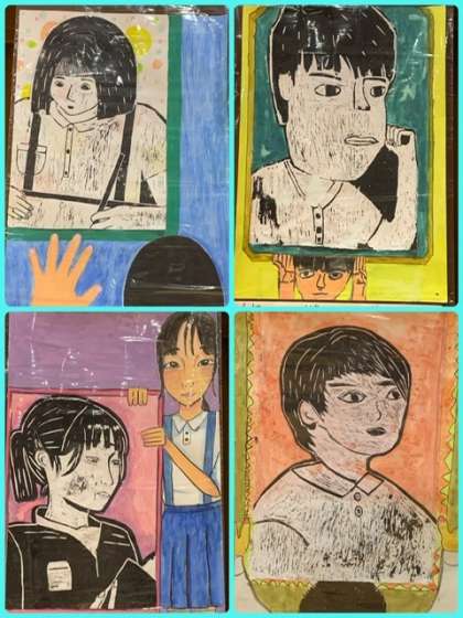 6年生の図工作品「自分をみつめて」です。版画と水彩画を組み合わせて・・鏡に写った自分と、それを見ている自分・・というイメージで作ったようです。小学校生活6年間で成長してきた・・今の自分自身が表現されていますね。