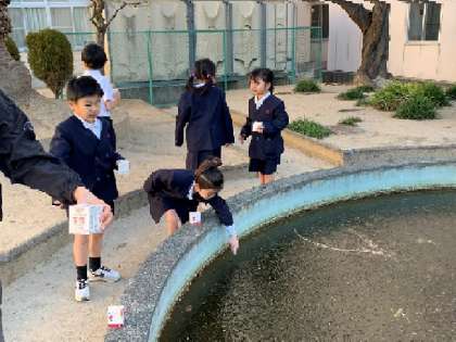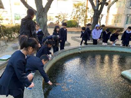 1月10日(金)、気温が下がって寒い日を迎えました。冷たい気温に、九条北小学校の中庭にある池にも氷がはっていました。登校してきた児童たちは、早速、池の氷を見つけて見に行っていました。「先生、池の氷が凍ていいるよ!早く見た方がいいよ!」と教えてくれました。