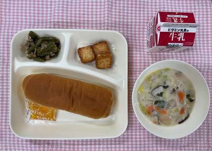 16日の給食は「コッペパン、はくさいのクリーム煮、あつあげのピリ辛じょうゆかけ、豚肉とさんどまめのオイスターソースいため、牛乳」でした。クリーム煮はまろやかな仕上がりで、好評でした。あつあげはほんのりピリ辛で、低学年でもおいしく食べることができました。