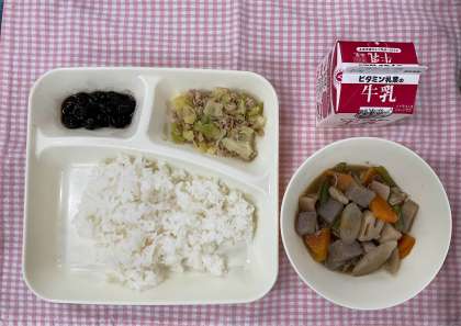 17日は「ごはん、筑前煮、ツナとキャベツのごまいため、黒豆の煮もの、牛乳」でした。筑前煮はれんこんやごぼうなどのしっかりかむ食材が入っていて、気がつけばよくかんで食べていたようです。