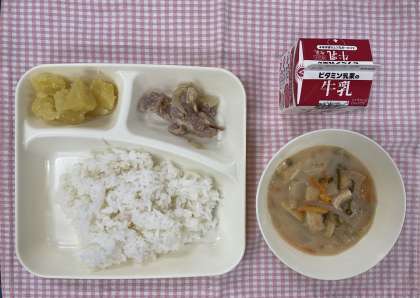 20日は「ごはん、鶏肉の塩こうじ焼き、かす汁、くりきんとん、牛乳」でした。鶏肉は塩こうじをからめて焼きました。柔らかく、うま味もあり大好評でした。かす汁はほんのり酒かすが入っていました。気づかずに食べている子もいるくらいでしたが、やはり体が温まりました。