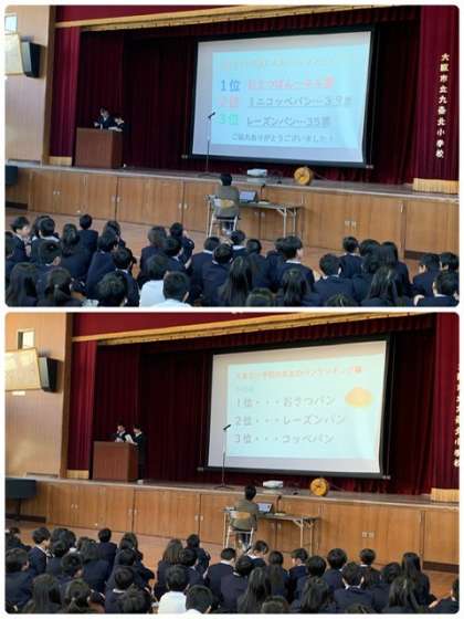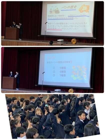 続いて、給食の小おかず「児童の好きなランキング」「先生の好きなランキング」を事前アンケートを実施して発表してくれました。さらに、「パンの歴史」も調べて発表してくれました。「戦後間もない1946年に、小学校でコッペパンと脱脂粉乳の学校給食が再開しました。給食でパン食の習慣を身につけた子どもたちが、大人になってもパンを好んで食べるようになって、日本の食卓にパンがなじんでいったそうです。」「九条北小学校の児童に人気のパンランキング」も発表してくれました。