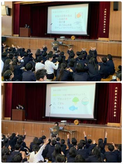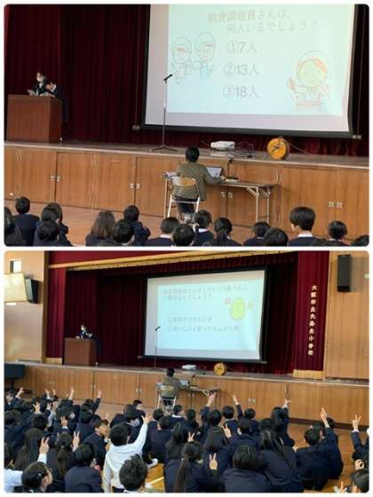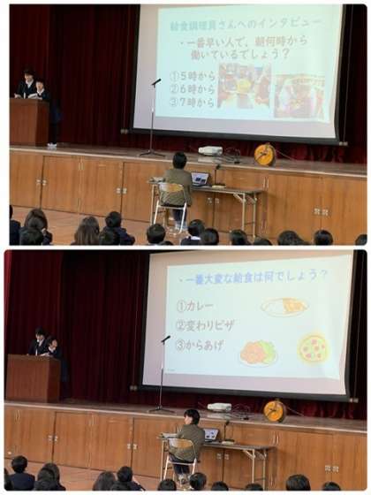 事前に給食調理員さんへインタビューをして作ったクイズも出題してくれました。「一番早い人で、朝何時から働いているでしょう?」「一番大変な給食は何でしょう?」「給食調理員さんは、何人いるでしょう?」「給食調理員さんをしていて一番うれしいことは何でしょう?」・・・お忙しい中、インタビューに協力いただいたことに感謝します。ちなみに、最後の質問の答えは、「おいしいと言ってもらえた時」だそうです。この後に続く、「給食の栄養クイズ」の正答率もとても高く、児童たちの給食に関する関心の高さに感心しました。