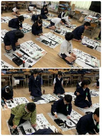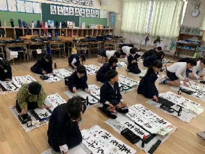 4年1組の書写の時間です。この日は、書初めをしました。全員が集中して取り組んでいます。お手本を見ながら、ていねいに、最後まで力を抜かないように・・・など、気をつけながら書き上げていました。「春を待つ」・・・まさに、みんなの気持ちがこもっています!