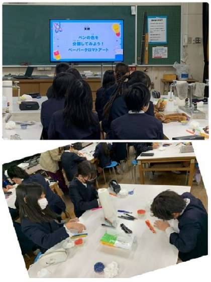 今日は、実験「ペンの色を分解してみよう! ペーパークロマトアート」を体験させてもらいました。実験する科学技術の名前は、「ペーパー クロマト グラフィー」といい、ろ紙を使って、色を分解する実験です。