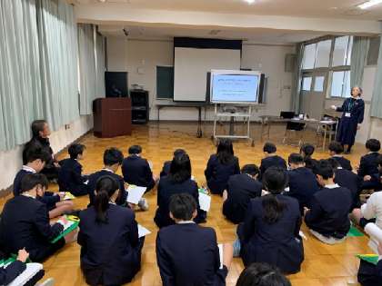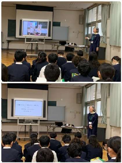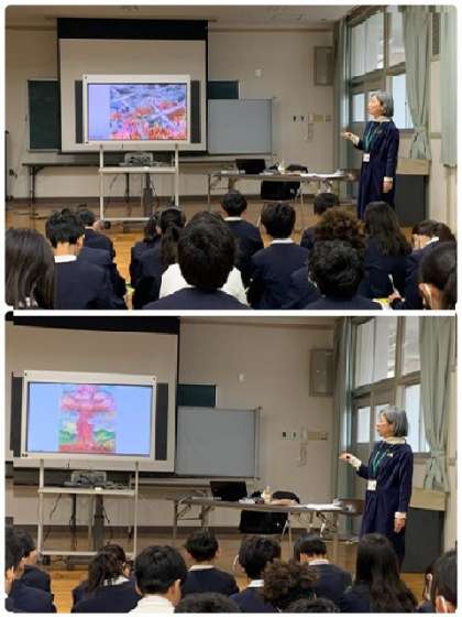 1月24日(金)、広島平和記念資料館より被爆体験伝承者の方にお越しいただき、6年生対象に被爆者の方の体験を伝えてもらいました。広島に原子爆弾が投下されてから80年が経ち、当時の様子を伝えていただいている被爆者の方も高齢になってきました。そこで、その思いを伝えるために「被爆体験伝承者」として被爆者の体験談を引き継いでいただいています。今日、お越しいただいた方も、そのお一人です。
