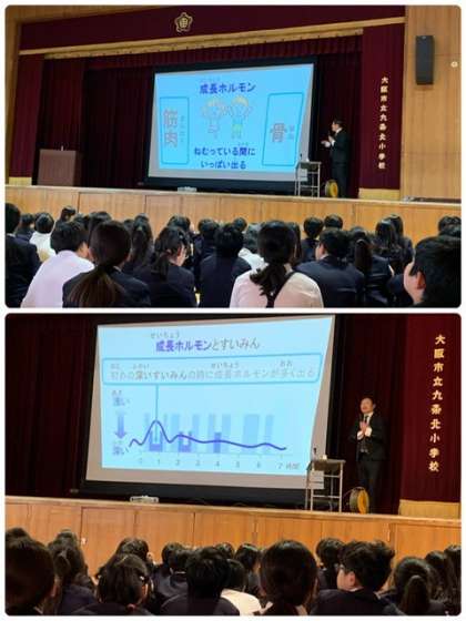 すいみんの大切さ、1つめは「元気」〜「毎日、くっすりねむると、体が元気になる。」だるさがなくなるし、体の調子が良くなる。そして、「心も元気」〜やる気が出てくよくよしなくなる。成長ホルモンも、眠りに入って1時間たったあたりが一番出るときと、グラフも使って説明してくれました。というように、1つ1つが児童にわかりやすい形で伝えられていきました。2つめは「勉強」、3つめは「運動」〜様々なデータを示しながら伝えてくれました。