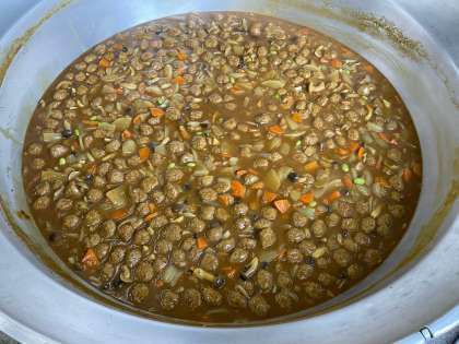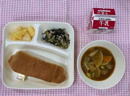 今日の給食は「コッペパン、ミートボールと野菜のカレー煮、ツナとこまつなのソテー、パインアップル(カット缶)、バター、牛乳」でした。カレー煮は、ふわふわのミートボールが入って子どもに大好評!にんじんやだいこんなどの野菜もおいしく食べることができました。こまつなはツナと一緒においしくソテーに。色どりもきれいでした。デザートのパインアップルは沖縄県産です。「沖縄からきてるんやぁ」「日本のパインアップルだったの」など、少し驚いた子もいました。