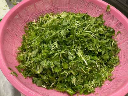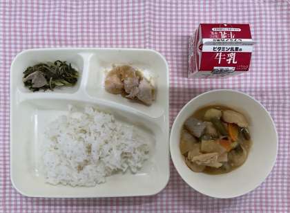 今日の給食は「ごはん、鶏肉のおろしじょうゆかけ、一口がんもとじゃがいものみそ煮、みずなの煮びたし、牛乳」でした。鶏肉はおろしじょうゆがかかっていて大人気。さっぱり味でも低学年もよく食べていました。煮びたしは豚肉が入ってうま味もアップ。みずなをおいしく食べることができました。