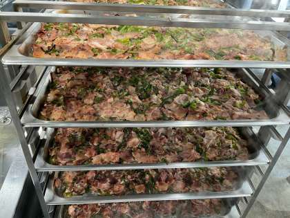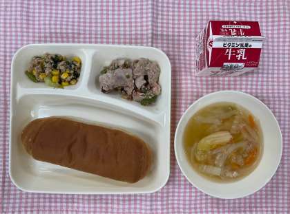 今日の給食は「黒糖パン、豚肉のオイスターソース焼き、中華スープ、ツナとチンゲンサイのいためもの、牛乳」でした。豚肉はオイスターソースの風味がよく、大好評でした。スープははくさいの甘み、鶏肉のうまみで、あっさりしていてもおいしく食べることができました。