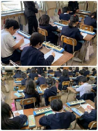 今日の学習のめあては、「3つの音で せんりつを つくろう」です。前の時間に考えた自分の名前の呼び方に音を当てはめていきます。みんなでやくそくを確認してから、各自で取り組んでいます。